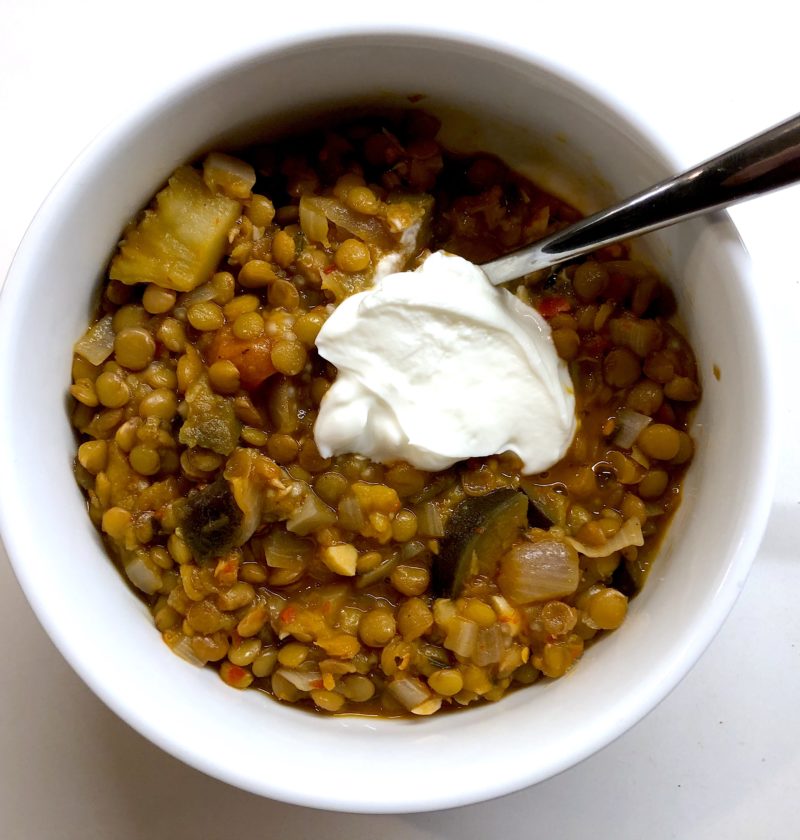 A nice and healthy Turkish stew made with lentils, eggplants, and tomatoes. Harissa paste adds a nice spicy flavor to the stew.