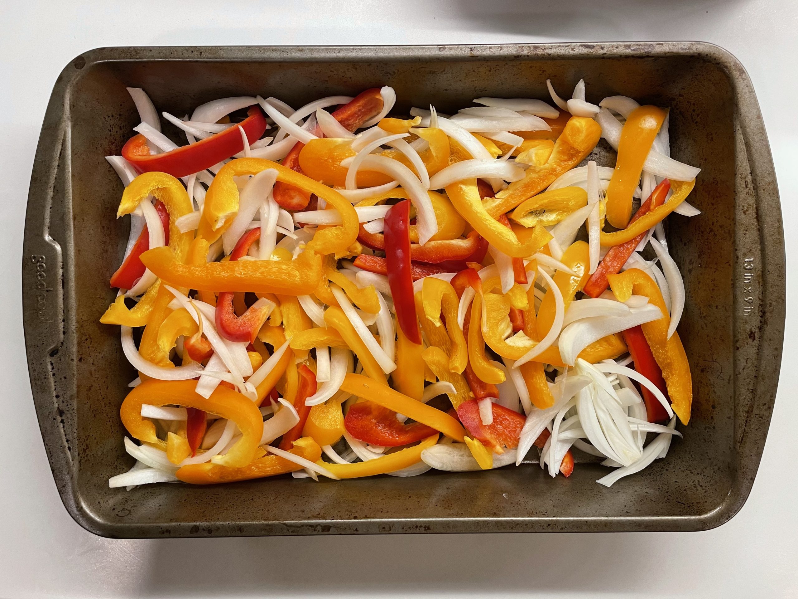 Take each of your peppers and slice them into thin strips. Then take your onion and cut it into into slivers. Place your pepper strips and onion slivers into a single baking pan and mix them up.
