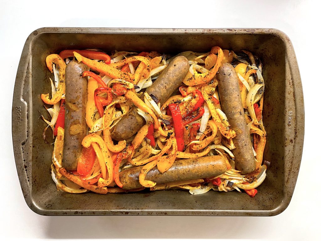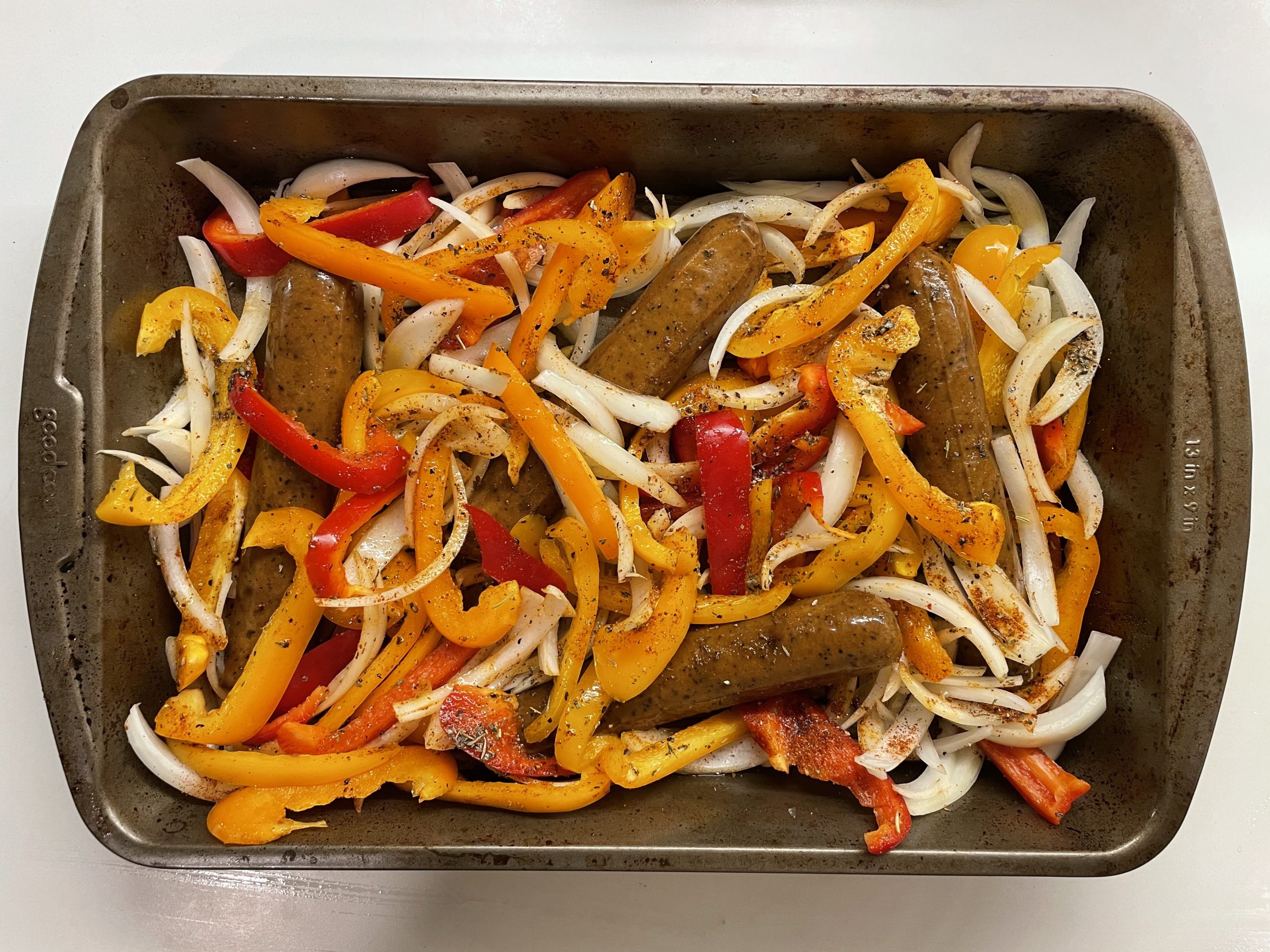 Season your vegetables with the paprika, herbes de provence, salt and pepper to taste, and olive oil. Toss the vegetables so they are evenly seasoned. Then place the sausages so they are nestled into the vegetable mixture.