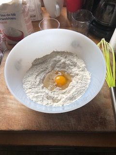 Put both flour in a large mixing bowl and dig a little well in the center. Breaks the eggs into the well,