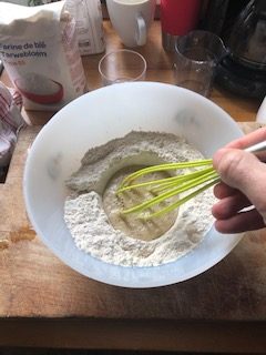 - Add water, keep whisking, until the batter is fluid but not totally liquid. Add salt. Let rest for several hours, one night if possible.