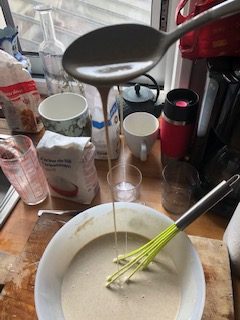 Just before using the batter, check consistency, add the oil, adjust with a little milk if not liquid enough (It tends to thicken a little as it rests)