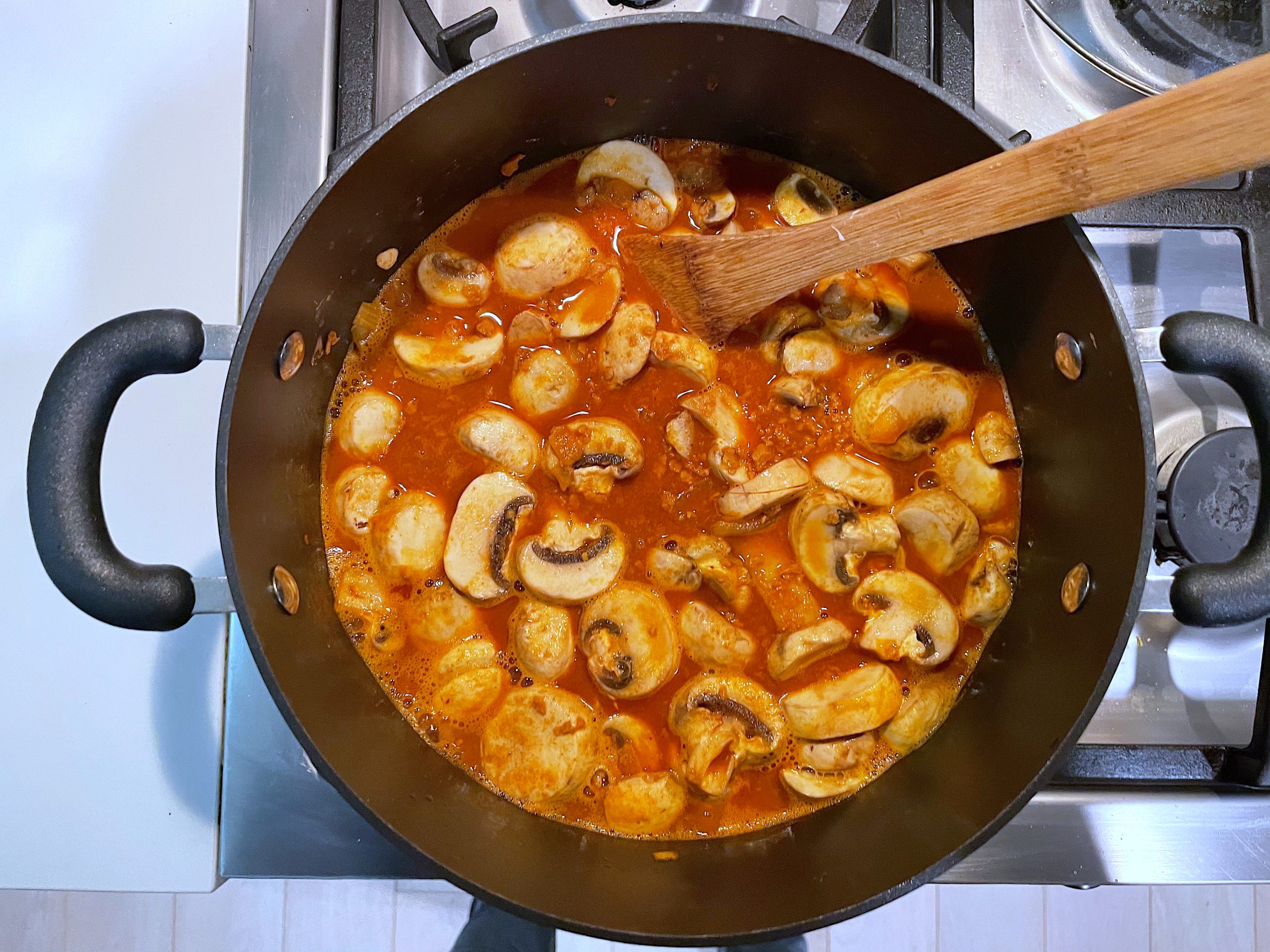 Add the potatoes, mushrooms, chorizo, broth, smoked paprika, and cayenne into the pot. Bring the contents to a boil and then reduce to a simmer and let it cook for another 20-25 minutes, until the potatoes are tender.