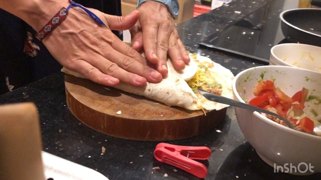 1. Place the small cut-out tortilla #2 on top of the fillings in tortilla #1.   Fold tortilla #1 up and around, closing the crunchwrap.