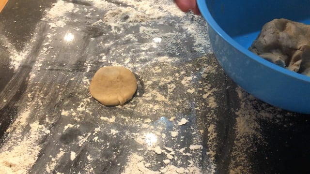 Form a small ball of dough (about the size of the palm of your hand when squashed) and roll it out on the floured surface, working it like pie crust.
